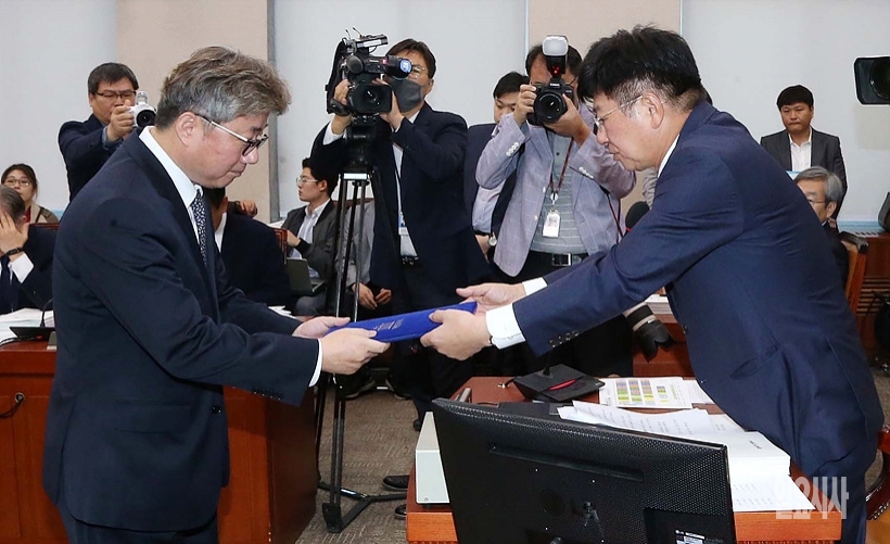 채희봉 한국가스공사 사장이 15일, 서울 여의도 국회 산업통상자원중소벤처기업위원회 회의실서 속개된 한국석유공사, 한국가스공사 등에 대한 국정감사에 앞서 선서문을 이종구 산자위원장에게 전달하고 있다.