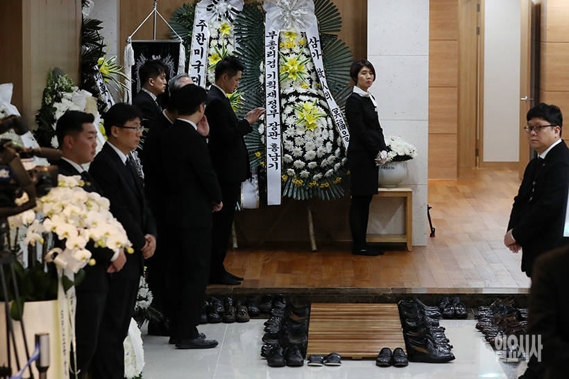 20일 서울 송파구 서울아산병원에 마련된 고 신격호 롯데그룹 명예회장의 빈소에서 관계자들이 조문객을 기다리고 있다.