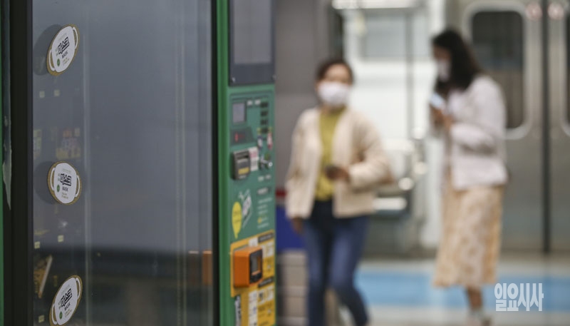 '지하철 혼잡도 150%이상(혼잡단계) 시 마스크 미착용 승객 탑승 제한'이 실행된 13일 오전 서울 동대문역 승강장 자판기에 마스크 판매를 알리는 스티커가 부착되어 있다.