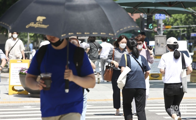 서울 동부권 지역에 폭염주의보가 내려진 가운데 9일 오후 서울 광화문 네거리를 지나는 시민들이 발걸음을 재촉하고 있다. 이날 기상청은 “건강관리에 유의해야 하며 농업, 축산업 등 피해가 없도록 신경 써달라”고 당부했다.