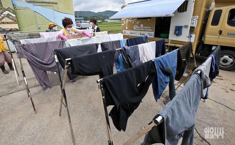 13일 오전 강원도 철원군 동송읍 이길리 마을에서 봉사자들이 옷을 말리고 있다.