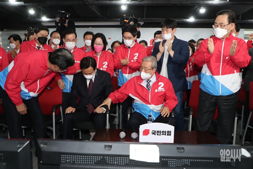 국민의힘 김종인 비상대책위원장과 오세훈 서울시장 후보가 7일 오후 서울 여의도 중앙당사에 마련된 상황실에서 4.7 보궐선거 방송사 출구조사 발표를 보고 기뻐하고 있다.