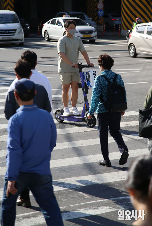 12일 오후 서울 광진구 건국대학교 인근에서 한 시민이 횡단보도에서 전동 킥보드를 타고 있다. 오는 13일부터 무면허로 전동 킥보드 이용 시 10만원의 범칙금을, 2명 이상이 전동 킥보드 한 대에 올라탈 경우 승차 정원 위반으로 단속돼 범칙금 4만원을 내야 한다. 또 안전모를 쓰지 않고 주행 시 범칙금 2만원이 부과된다.