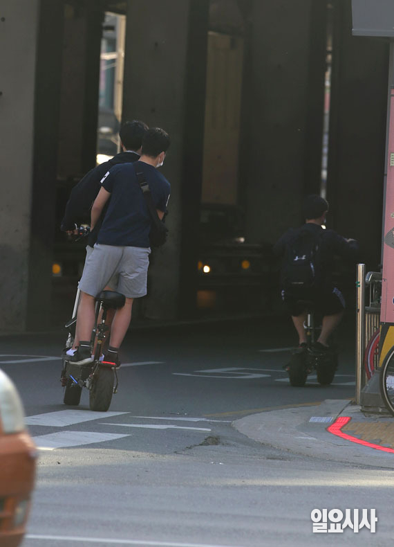 12일 오후 서울 광진구 건국대학교 인근에서 시민들이 도로에서 전동 킥보드를 타고 있다. 오는 13일부터 무면허로 전동 킥보드 이용 시 10만원의 범칙금, 2명 이상이 한 대에 올라탈 경우 승차 정원 위반으로 단속돼 범칙금 4만원을 내야 한다. 또 안전모를 쓰지 않고 주행 시 범칙금 2만원이 부과된다.