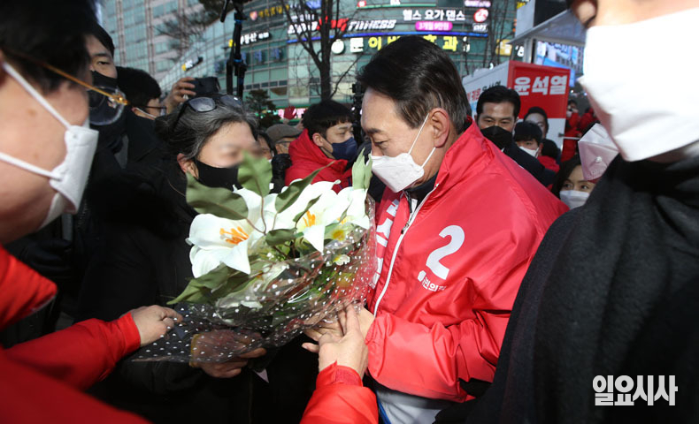 국민의힘 윤석열 대선 후보가 17일 오후 서울 종로구 동묘앞역 인근에서 지지를 호소하고 있다.