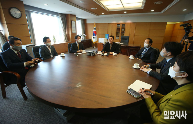 윤석열 당선인이 14일 오전 서울 종로구 금융감독원 연수원에 마련된 집무실에서 열린 안철수 인수위원장 등과 함께한 티타임에서 발언하고 있다.