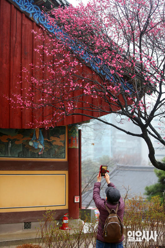 봄비가 내리는 14일 오후 서울 강남구 봉은사에서 꽃망울을 터뜨린 홍매화가 봄을 알리고 있다.