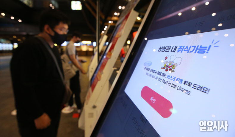사회적 거리두기가 전면 해제됨에 따라 영화관에서 취식이 가능해진 가운데 26일 오전 서울 소재 한 영화관에서 고객이 키오스크를 통해 팝콘을 주문하고 있다.