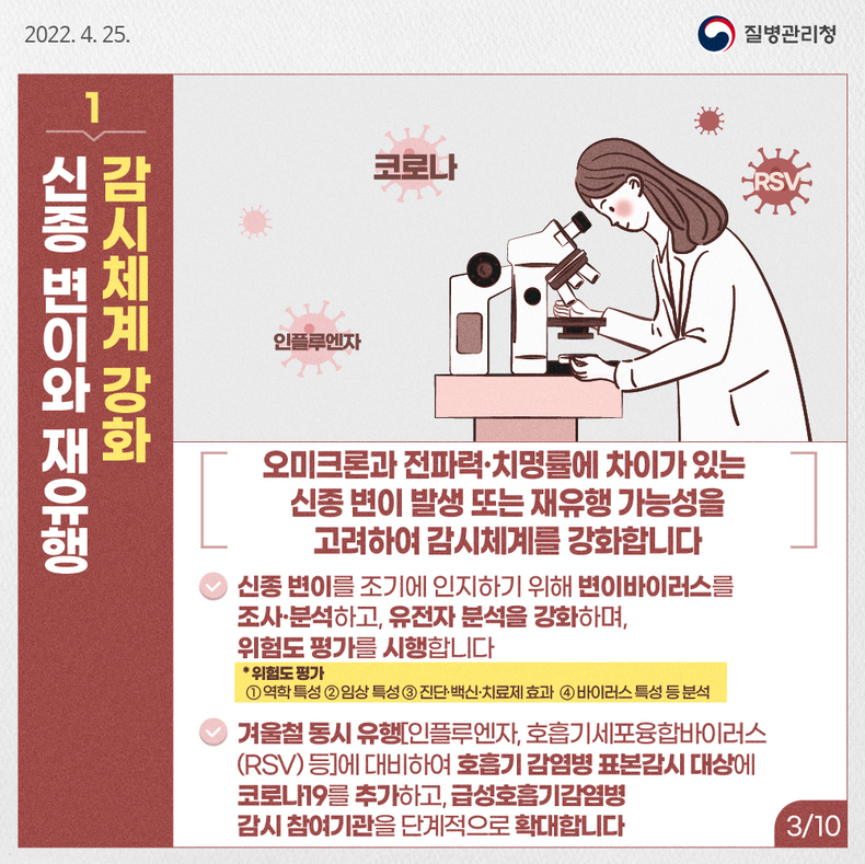 오미크론과 전파력·치명률에 차이가 있는 신종변이 발생 또는 재유행 가능성을 고려해 감시체계를 강화합니다.