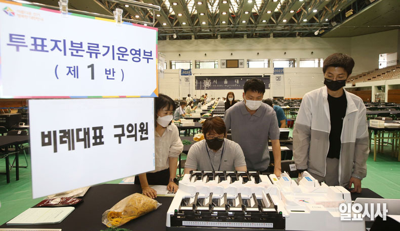 6.1 지방선거를 하루 앞둔 31일 오후 서울 관악구 서울대학교 체육관에서 중앙선거관리위원회 관계자들이 개표소 설비점검 및 분류기 모의시험을 하고 있다.