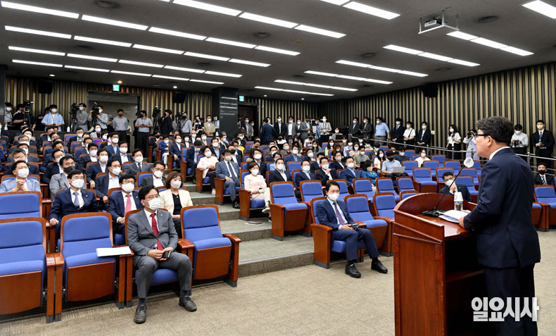 국민의힘 권성동 원내대표가 4일 오전 서울 여의도 국회에서 열린 긴급 의원총회에서 모두발언을 하고 있다.