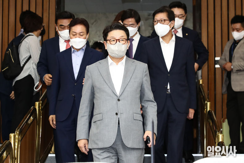 국민의힘 권성동 대표 직무대행 겸 원내대표가 27일 오전 서울 여의도 국회에서 열린 '국민의힘-부산·울산·경남 예산정책협의회'에서 기념촬영을 하고 있다.