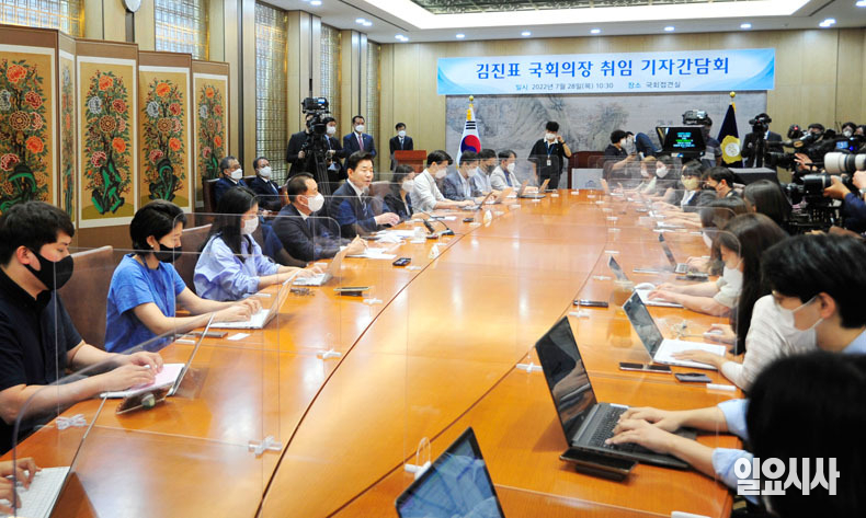 김진표 국회의장이 28일 오전 서울 여의도 국회에서 열린 취임 기자간담회에서 인사말을 하고 있다.