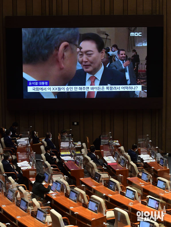 22일 오후 서울 여의도 국회 교육·사회·문화 대정부질문이 진행되는 가운데 윤석열 대통령의 비속어 논란 관련 영상이 본회의장 전광판에 켜져 있다.