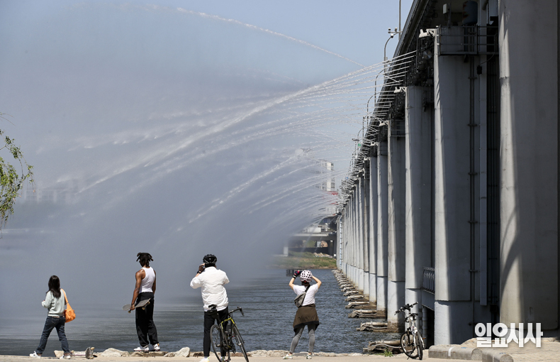 한낮 서울 기온이 28도까지 오르며 초여름 날씨를 보이고 있는 가운데 19일 오후 서울 잠수교를 지나는 시민들이 분수를 보며 더위를 식히고 있다.