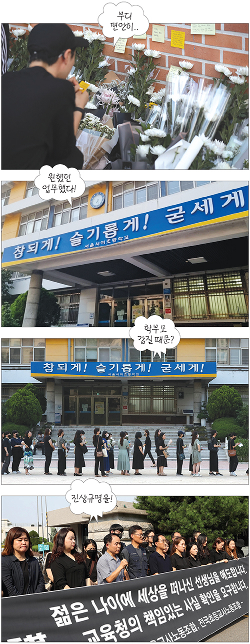 서울시교육청 등에 따르면 서이초등학교 1학년 담임이었던 교사가 지난 18일 교내에서 숨진 채 발견됐다고 전해진다. 교원단체는 이번 사건이 학부모의 괴롭힘으로 발생했다고 제기 중이다. 현재 경찰이 해당 사안을 수사 중이다.