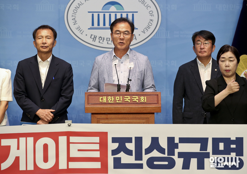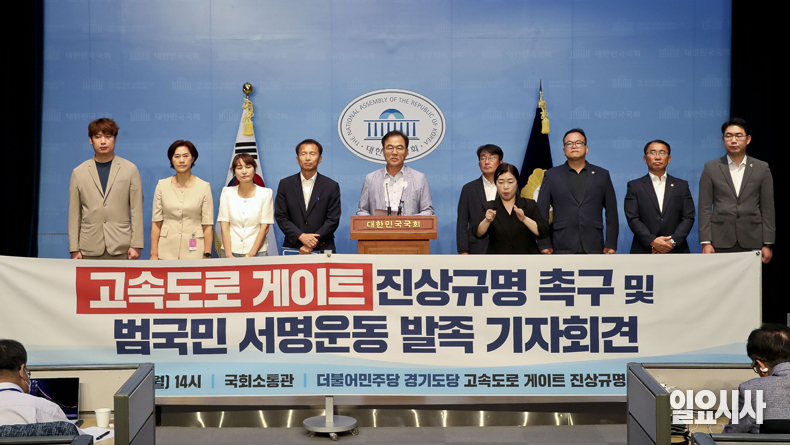 더불어민주당 경기도당 대통령 처가 고속도로 대책위원회 관계자들이 14일 오후 서울 여의도 국회 소통관에서 '고속도로 게이트 진상규명 촉구 및 범국민 서명운동 발족 기자회견'을 갖고 있다.