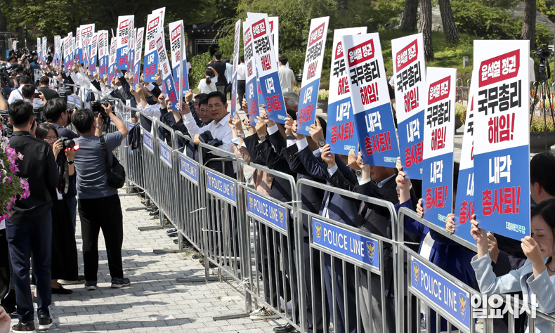 이날 피켓 시위에 나선 민주당 의원들은 한덕수 국무총리에 대한 해임과 내각 총사퇴를 촉구했다.