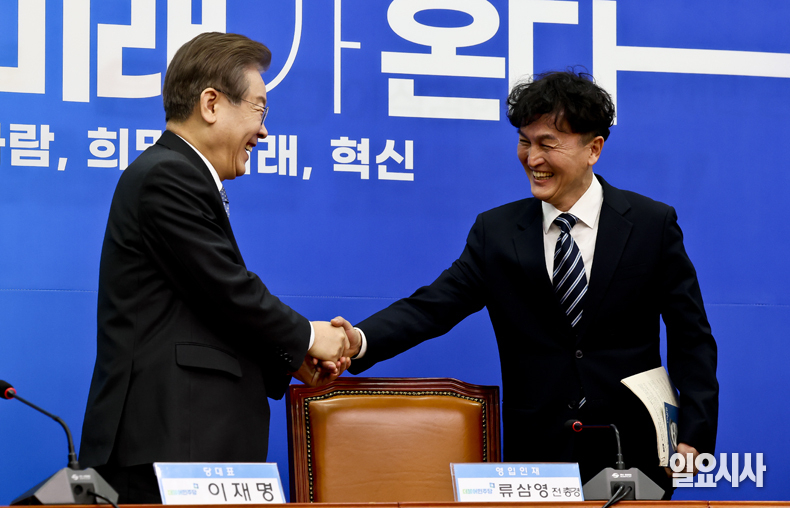 더불어민주당 이재명 대표가 18일 서울 여의도 국회에서 열린 3차 인재영입식에서 류삼영 전 경찰 총경과 악수를 나누고 있다.