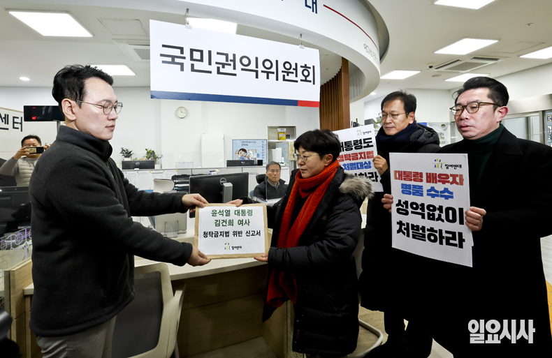 참여연대 활동가들이 19일 서울 종로구 정부서울청사 국민권익위원회 정부합동민원센터에서 '윤석열 대통령과 김건희 여사에 대한 부정청탁 및 금품 등 수수 금지에 관한 법률(청탁금지법) 위반 신고서'를 제출하고 있다.