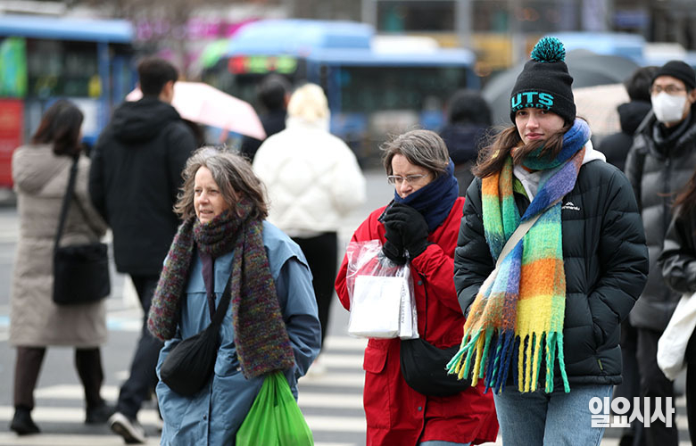 절기상 입춘이 지난 5일 서울 종로구 광화문 네거리를 지나는 시민들이 우산을 쓰고 횡단보도를 건너고 있다.