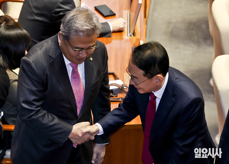 국민의힘 박진 의원이 21일 오전 서울 여의도 국회에서 열린 제413회 국회(임시회) 제3차 본회의에서 김도읍 의원와 악수하고 있다.