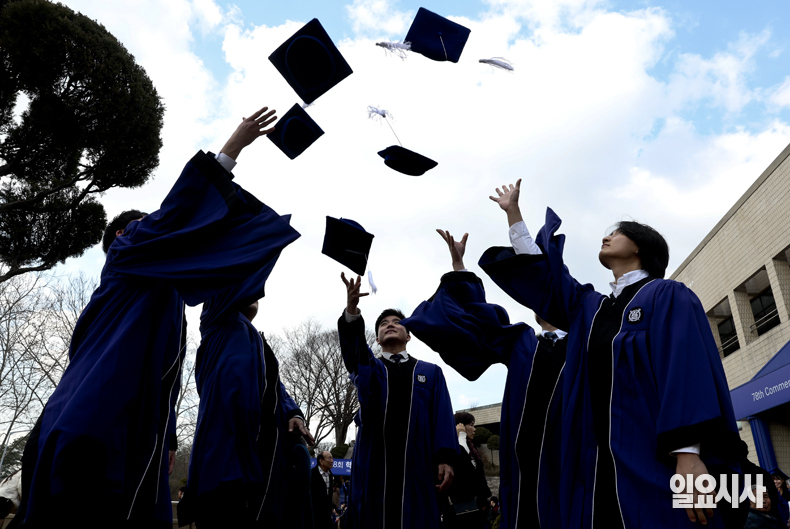 26일 서울 관악구 서울대학교에서 열린 제78회 학위수여식에서 졸업생들이 학사모를 하늘 높이 날리고 있다.