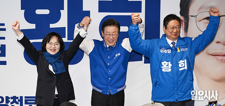 더불어민주당 이재명 대표(사진 가운데)가 6일 오후 서울 양천구에 마련된 양천갑 황희 후보 사무실을 방문해 황 후보(오른쪽), 이나영 전 예비후보와 만세를 하고 있다.