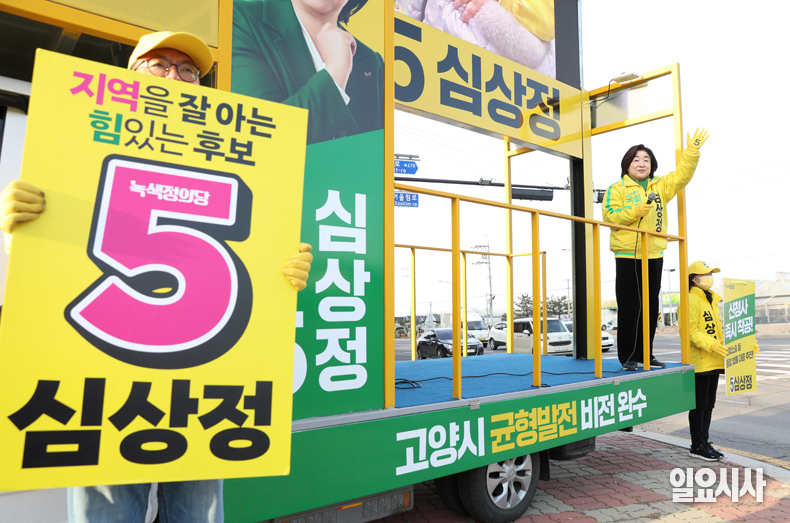 녹색정의당 경기 고양시갑 심상정 후보가 2일 오전 경기도 고양시 덕양구 호국로에서 출근길에 오른 시민들에게 인사를 하고 있다.