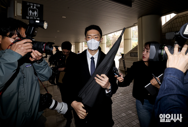 전직 대통령 전두환씨의 손자 전우원씨가 3일 오후 서울 서초구 서울고등법원에서 열린 마약류관리법 위반 혐의 항소심 선고공판에 출석하고 있다.