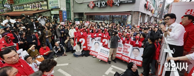 국민의힘 김현준 수원시갑(왼쪽부터) 후보와 이수정 수원정 후보, 한동훈 비상대책위원장, 홍윤오 수원을 후보가 8일 오후 수원시 장안구 북수원시장 일대에서 시민들에게 지지를 호소하고 있다.