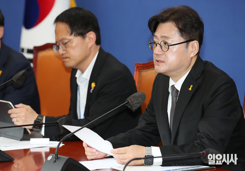 더불어민주당 홍익표 원내대표가 16일 오전 서울 여의도 국회에서 열린 원내대책회의에서 발언을 하고 있다.