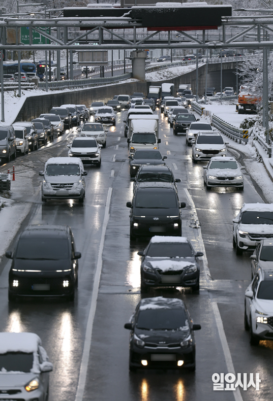 밤 사이 서울 전역에 큰 눈이 내린 가운데 27일 오전 서울 동부간선도로 하행선 방면을 지나는 차량들이 서행하고 있다.