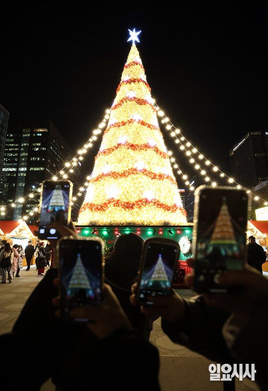 17일 오후 서울 종로구 광화문광장에서 열린‘산타마을’ 콘셉트 크리스마스 광화문마켓에서 시민들이 휴대폰으로 트리를 촬영하고 있다.