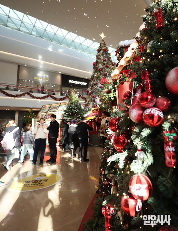 쌀쌀한 날씨가 이어지고 있는 23일 오후 경기도 하남 스타필드에 설치된 트리 앞에서 시민들이 추위를 피하고 있다.