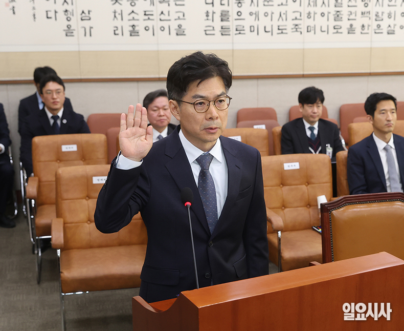 마용주 대법관 후보자가 26일 오전 서울 여의도 국회에서 열린 대법관 후보자 인사청문특별위원회에서 선서를 하고 있다.