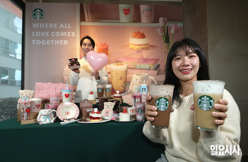 5일 오전 서울 중구 스타벅스 한국프레스센터점에서 모델들이 '밸런타인데이 시즌 상품'을 선보이고 있다.