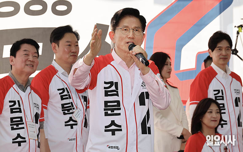 국민의힘 김문수 대선 후보가 20일 오후 서울 송파구에서 열린 "송파를 새롭게" 유세에서 유권자들을 향해 지지를 호소하고 있다.