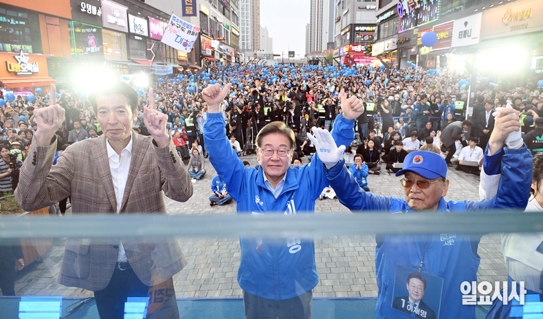 더불어민주당 이재명 대선 후보가 제21대 대통령선거 재외국민투표가 시작된 20일 경기 김포시 구래역 문화의 거리에서 주먹을 들어보이고 있다.