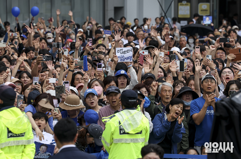 더불어민주당 이재명 대선후보가 2일 경기 하남시 스타필드 하남점 앞 광장서 열린 유세를 위해 연단에 오르고 있다.