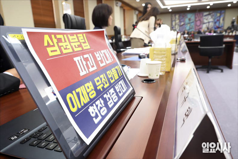 15일 서울 서초구 대법원에서 열린 국회 법제사법위원회의 대법원에 대한 2025 국정감사에서 국민의힘 의원석에 '삼권분립 파괴 반대'가 적힌 피켓이 걸려있다.