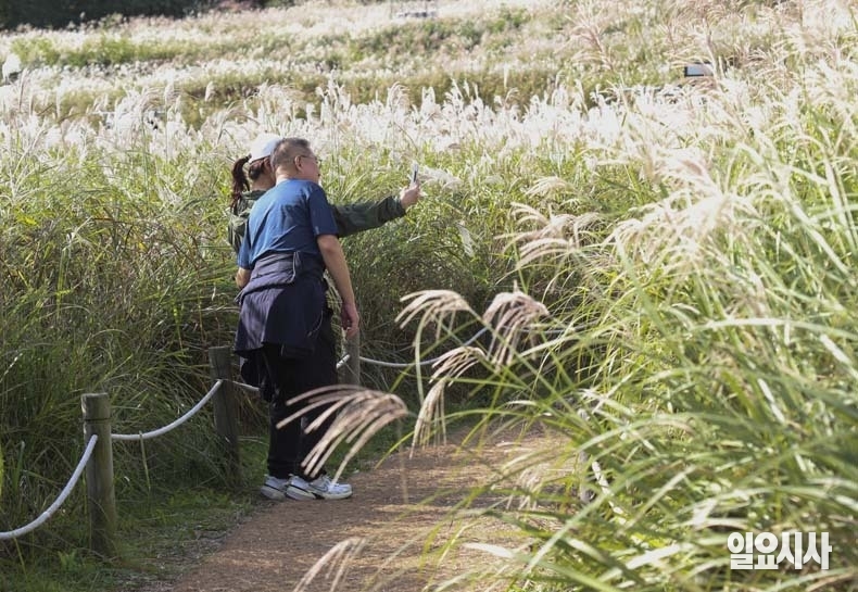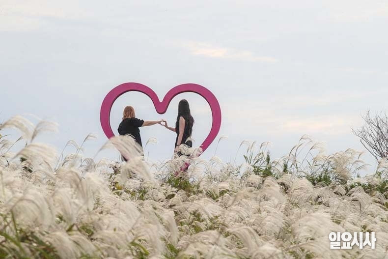 서울억새축제를 하루 앞둔 17일 오후 서울 마포구 하늘공원을 찾은 시민들이 하트 모양 구조물에서 사진 촬영을 하고 있다.
