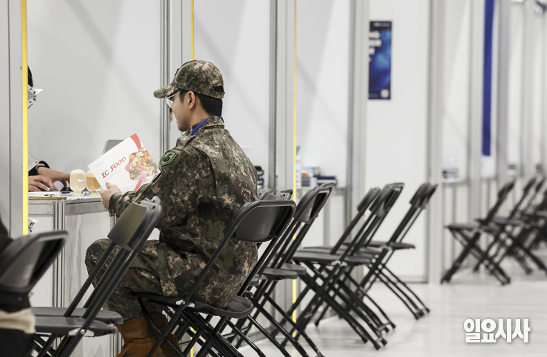 21일 오전 서울 강서구 코엑스마곡에서 열린 '2025 상생협력 채용박람회'를 찾은 군 장병이 참가사 부스에서 채용관련 상담을 받고 있다.