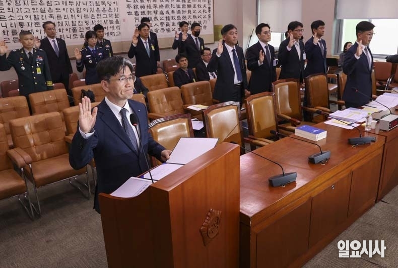 오동운 고위공직자범죄수사처장이 24일 오후 서울 여의도 국회에서 열린 법제사법위원회 고위공직범죄수사처에 대한 국정감사에 출석해 증인선서를 하고 있다.