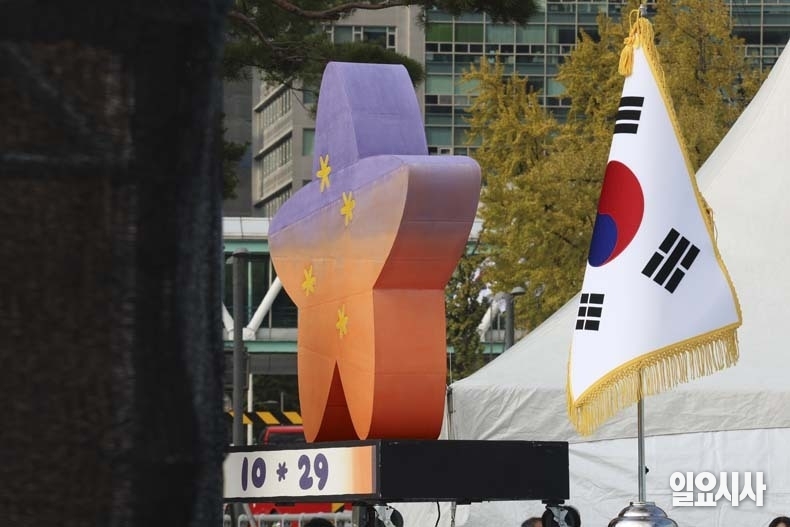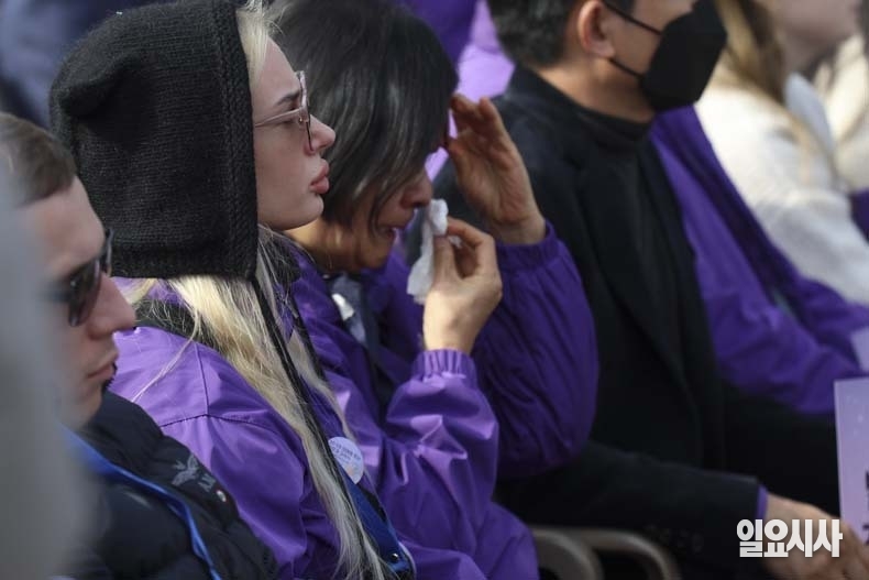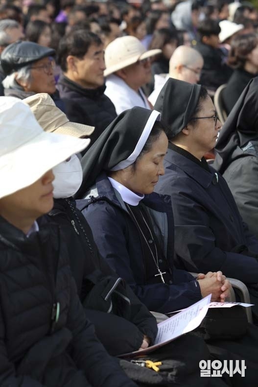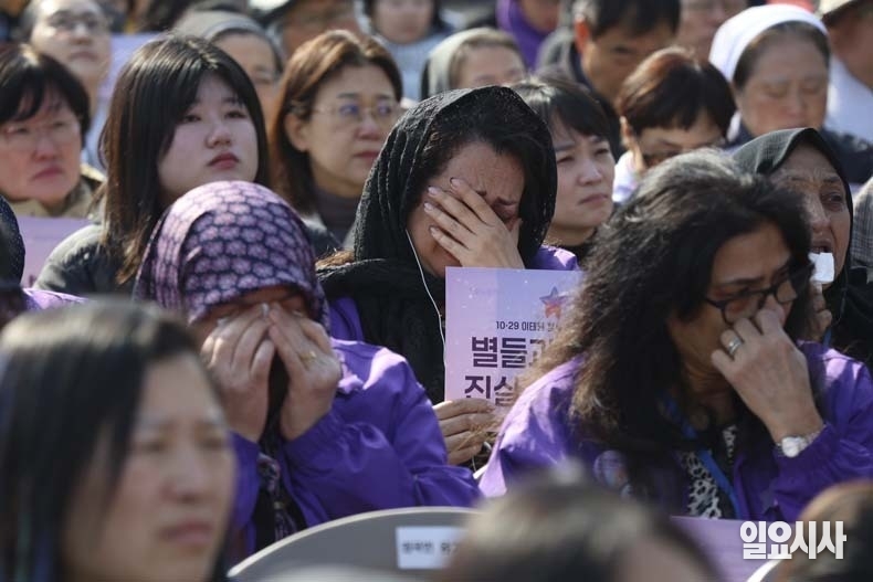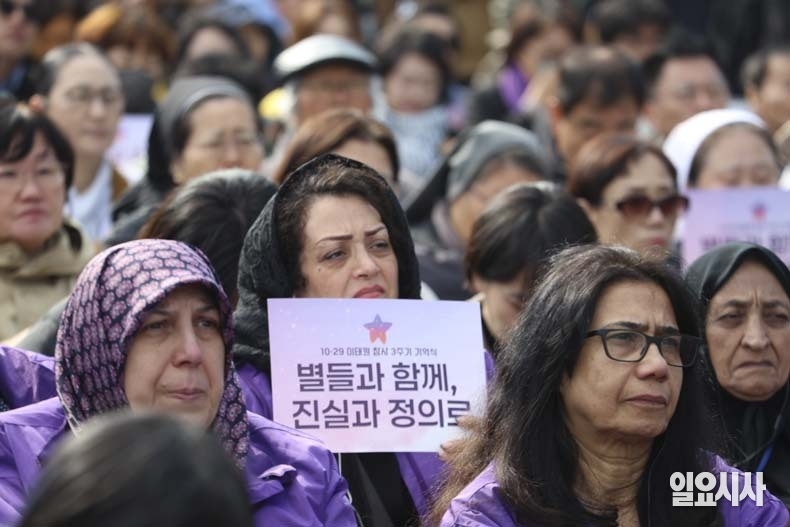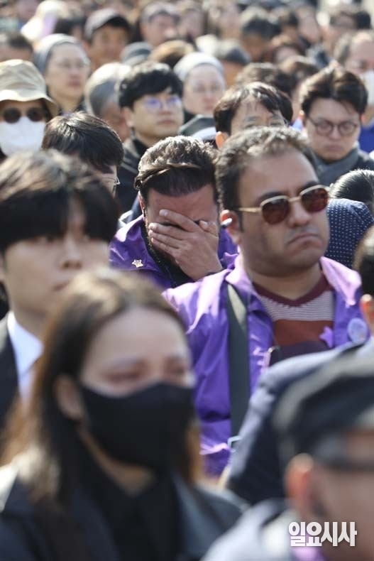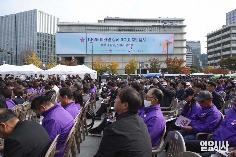 이태원 참사 3주기를 맞아 29일 오전 서울 종로구 광화문광장에서 열린 ‘10·29 이태원 참사 3주기 기억식’에 참석자들이 희생자들을 추모하는 묵념을 하고 있다.