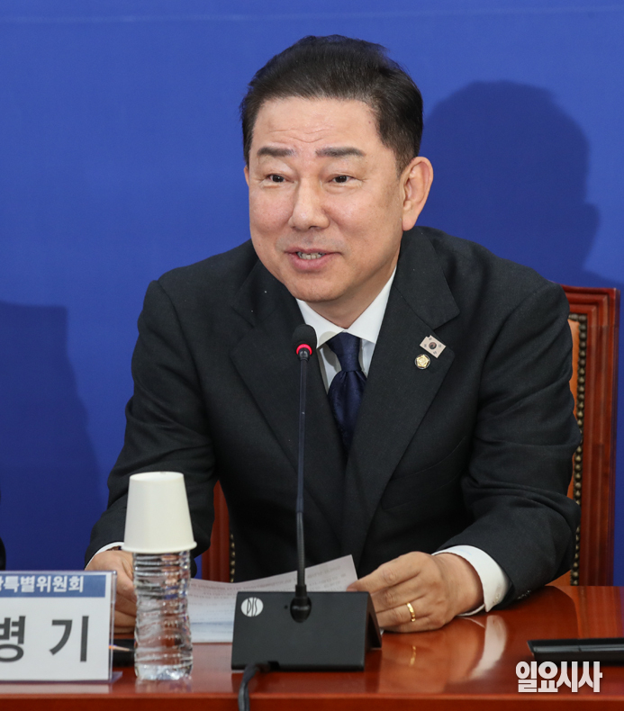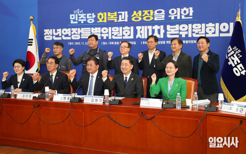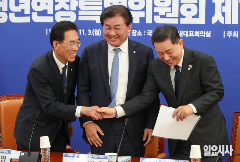 더불어민주당 김병기 원내대표(오른쪽부터)와 소병훈 정년연장특별위원회 위원장, 김주영 간사가 3일 오전 서울 여의도 국회에서 열린 ‘정년연장특별위원회 제1차 본위원회의’에서 인사를 나누고 있다.