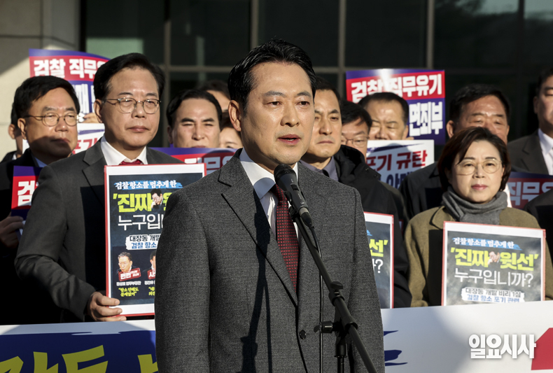 국민의힘 송언석 원내대표가 11일 오전 서울 서초구 대검찰청 앞에서 열린 '대검찰청 긴금 현장 규탄대회'에서 발언하고 있다.