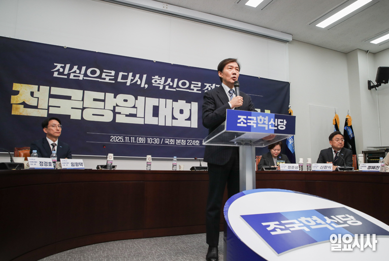 조국혁신당 조국 전 비상대책위원장이 11일 오전 서울 여의도 국회에서 열린 ‘2025 조국혁신당 전국당원대회 출발식’에서 발언하고 있다.
