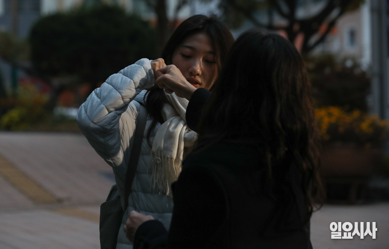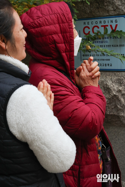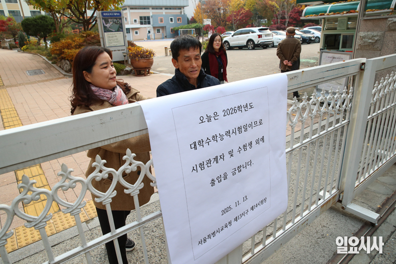 2026학년도 대학수학능력시험(수능)이 치러지는 13일 오전 서울 영등포구 여의도여자고등학교 고사장에 도착한 수험생이 학부모와 손을 맞잡고 인사하고 있다.