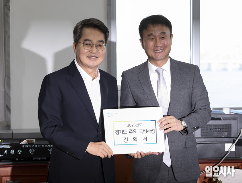 김동연 경기도지사(왼쪽)가 17일 오후 서울 여의도 국회 예산결산특별위원장실에서 한병도 위원장과 기념촬영을 하고 있다. 이날 김 지사는 한병도 예결위원장을 만나 2026년도 경기도 주요 국비사업 건의서를 제출했다.